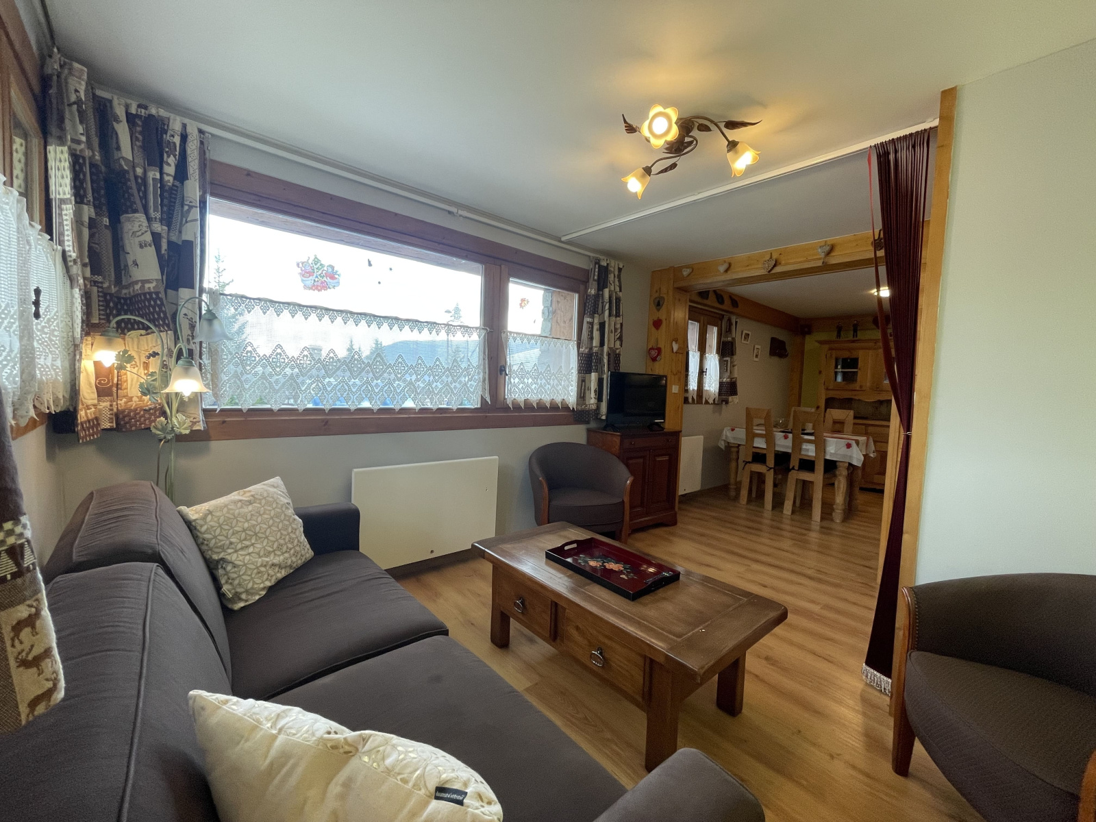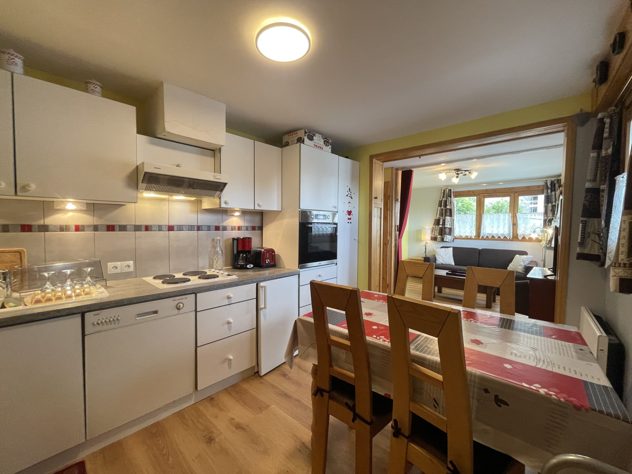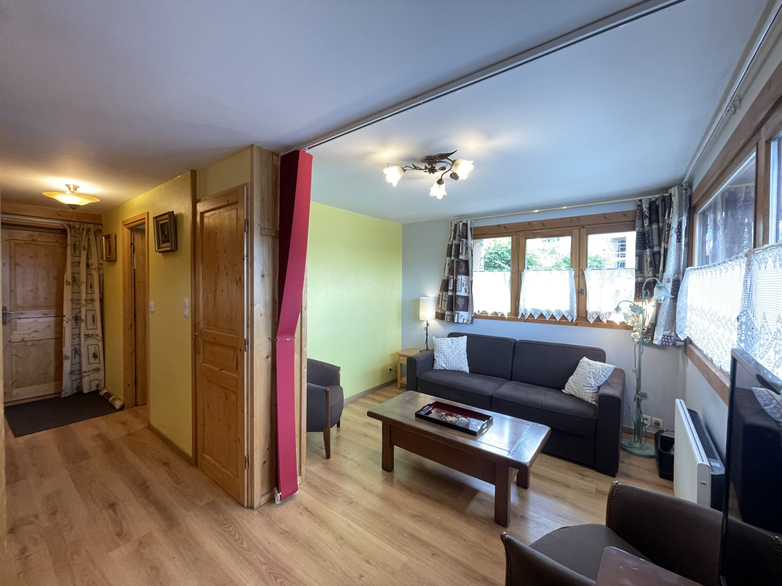 Un hall d’entrée avec rangement, une cuisine ouverte sur le salon-séjour, une salle d'eau, un wc séparé et une chambre avec coin montagne.