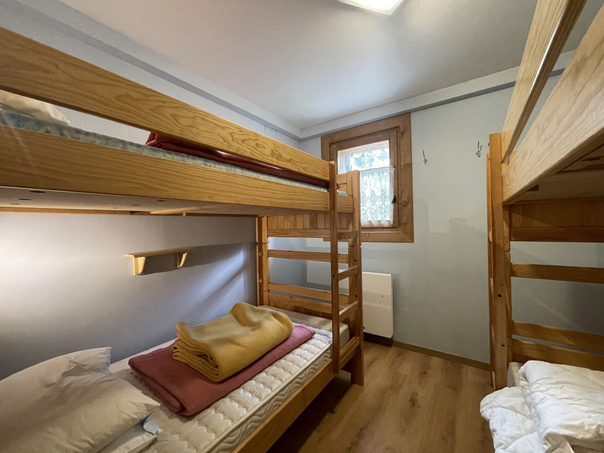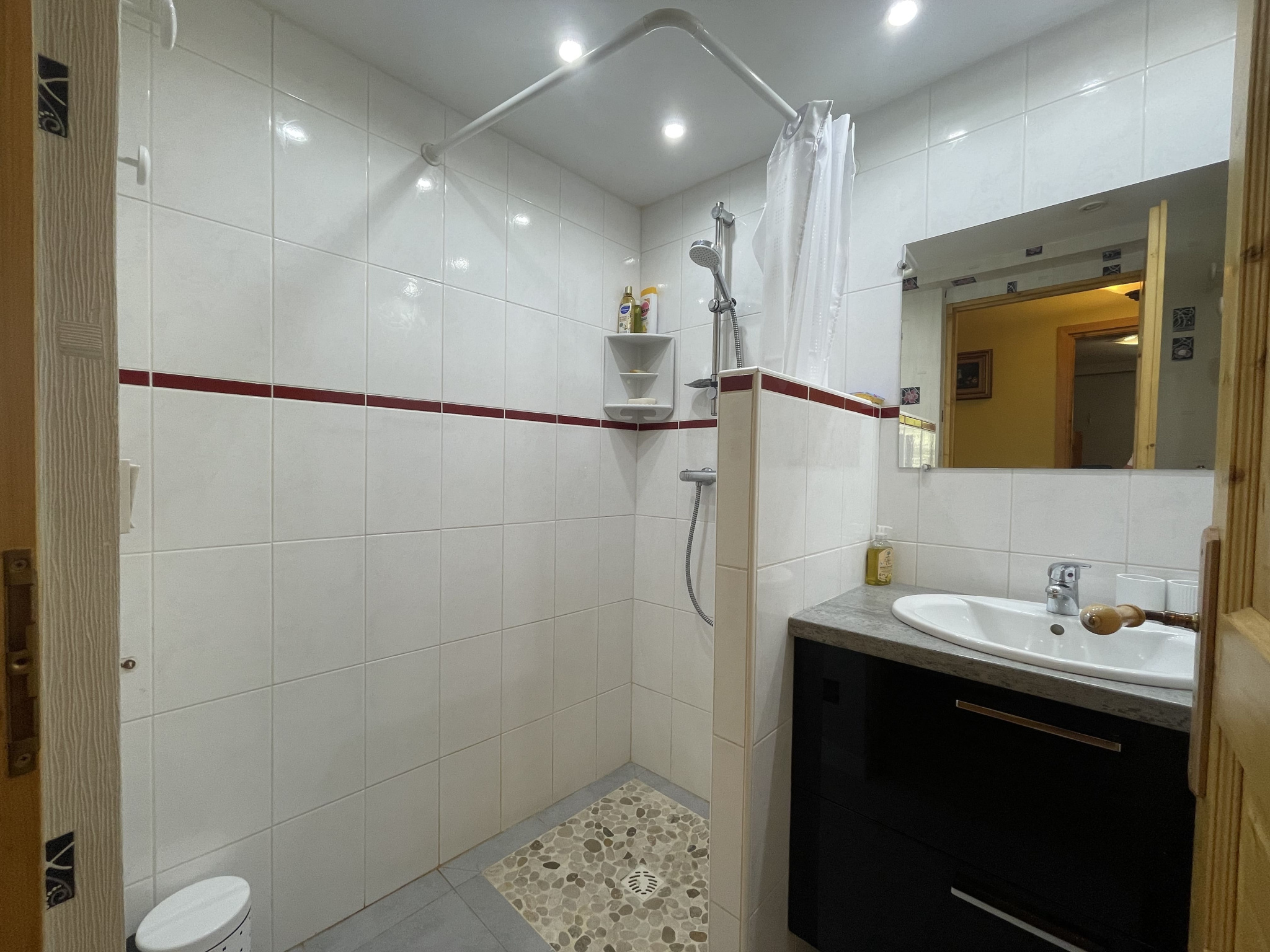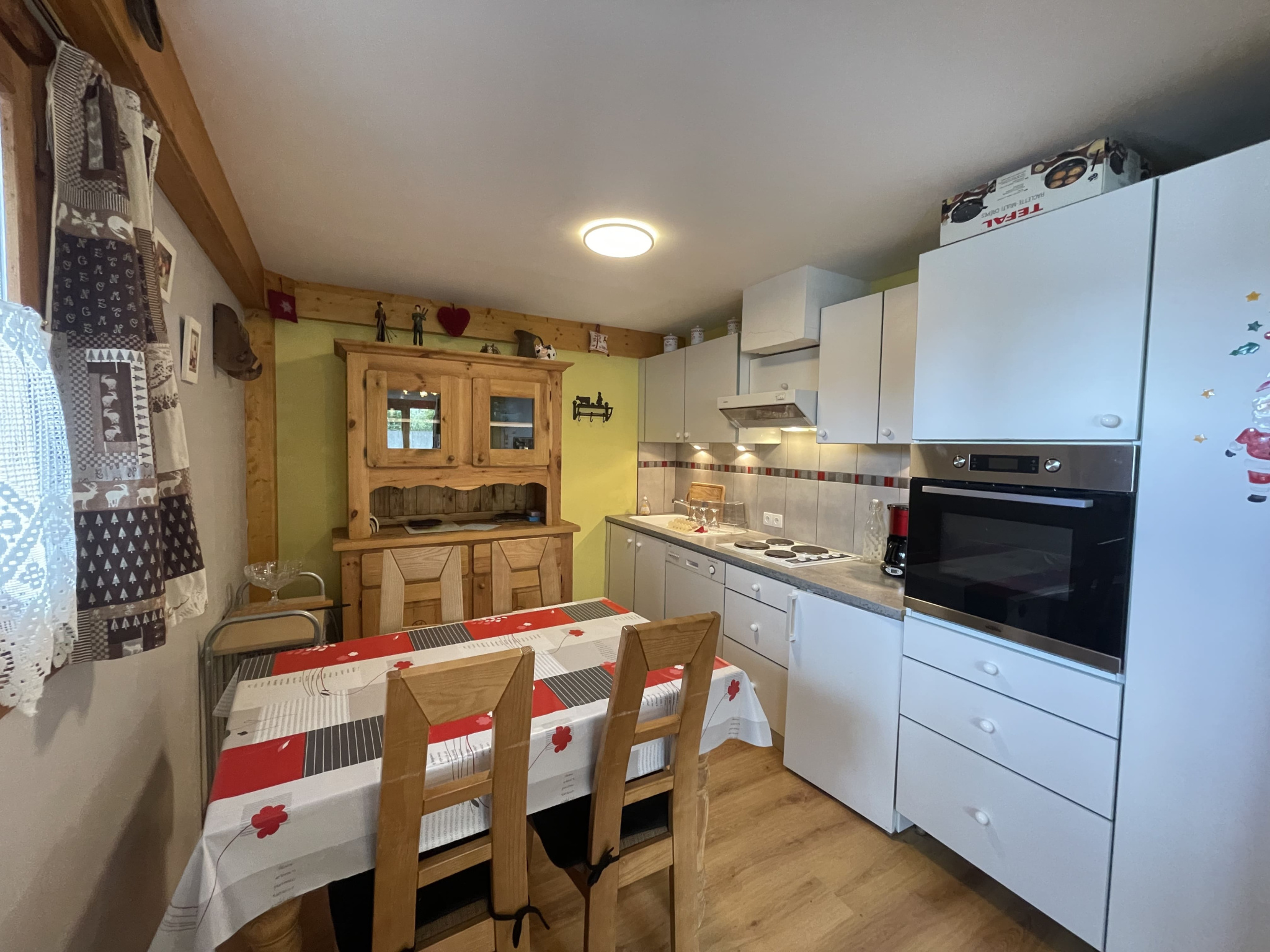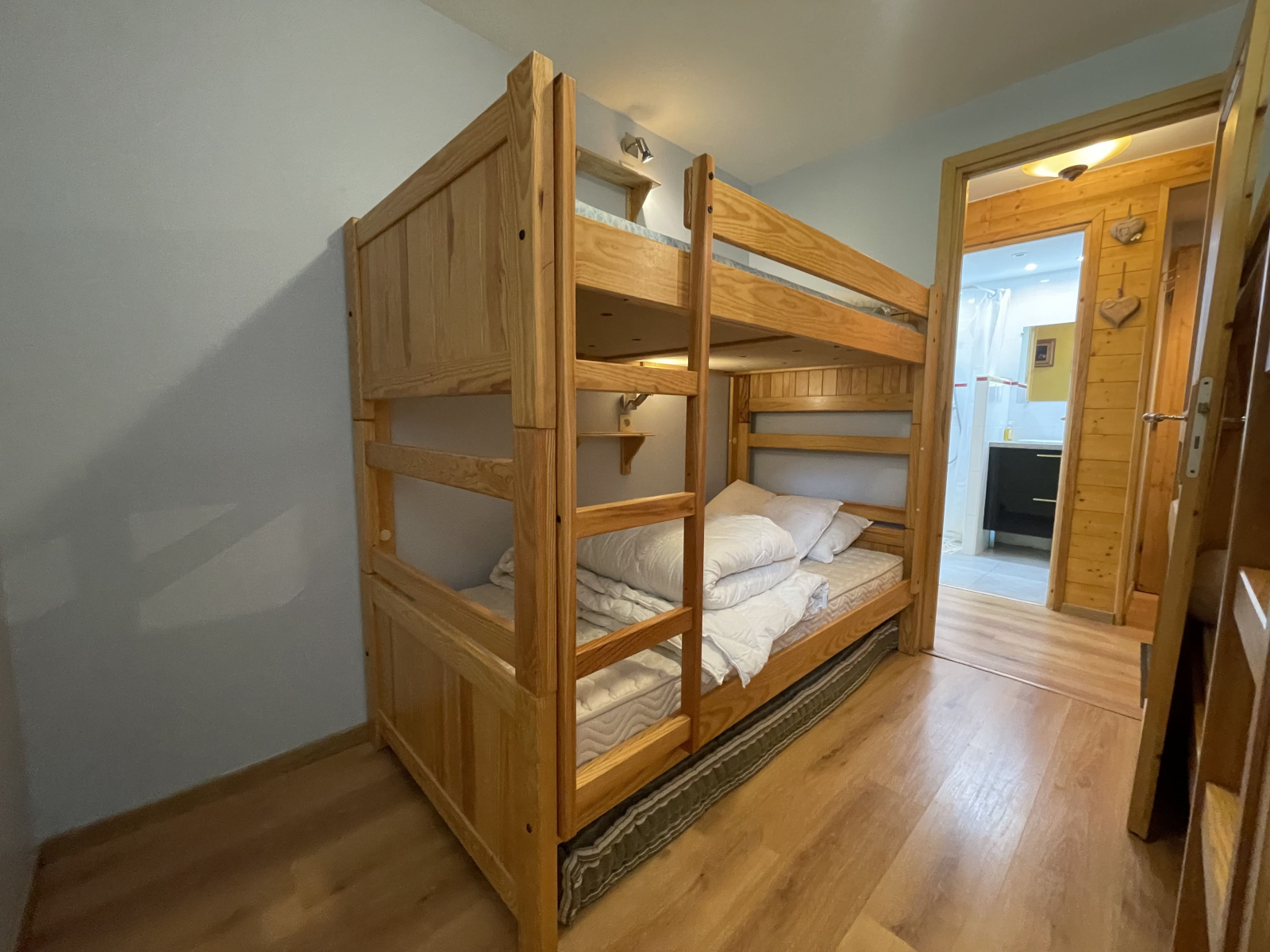 Un hall d’entrée avec rangement, une cuisine ouverte sur le salon-séjour, une salle d'eau, un wc séparé et une chambre avec coin montagne.