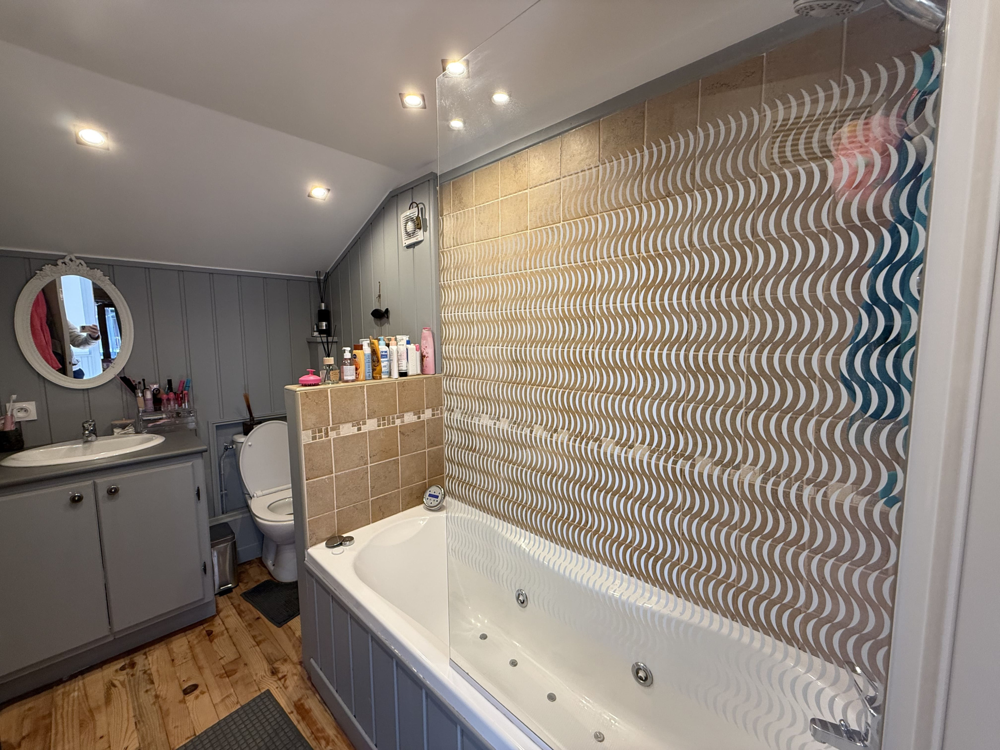 À l’étage : Un salon / séjour avec cheminée, une chambre ainsi qu’une salle de bains avec WC.