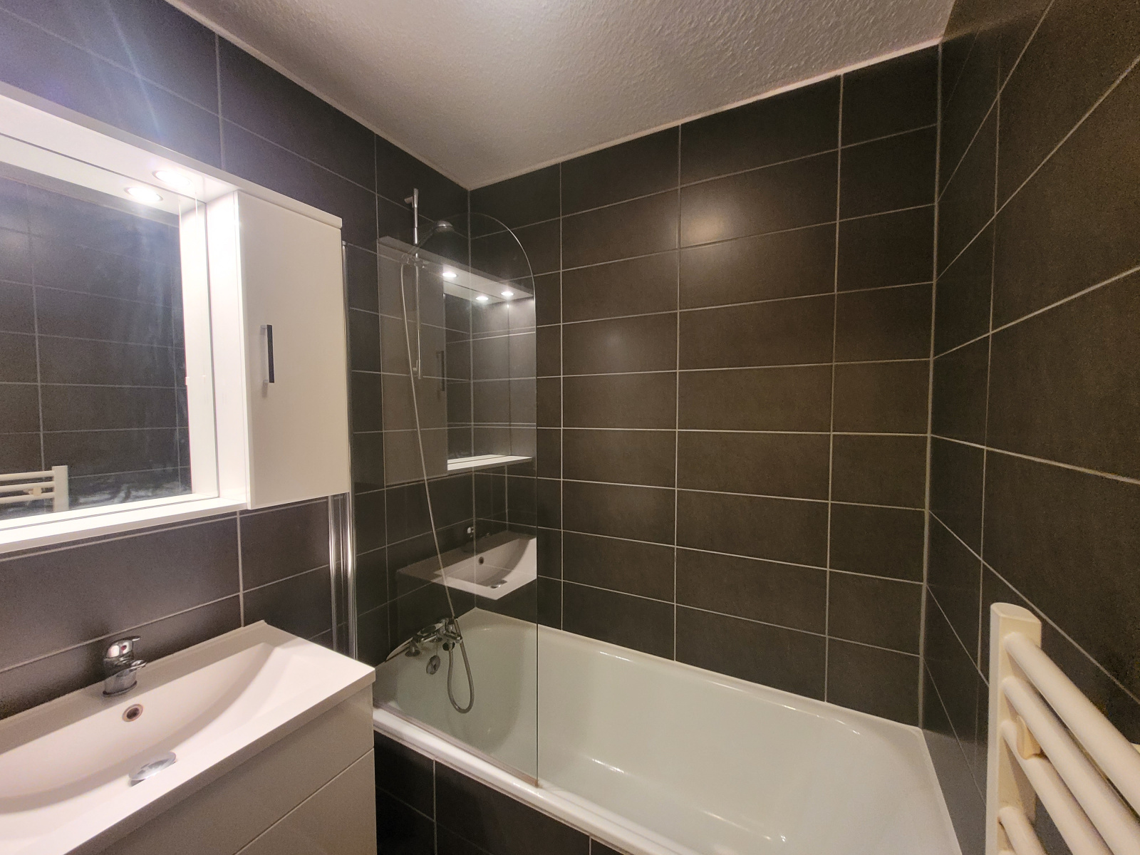 Cet appartement d’une chambre offre un espace de vie confortable, comprenant un salon-séjour avec une cuisine ouverte, une salle de bain et un WC séparé.