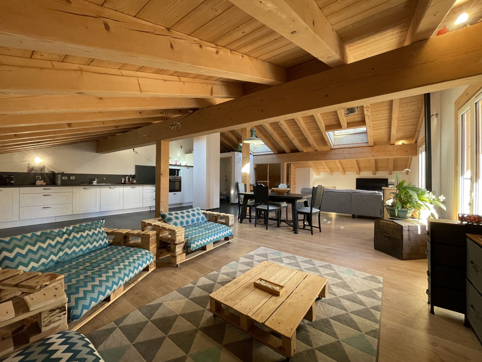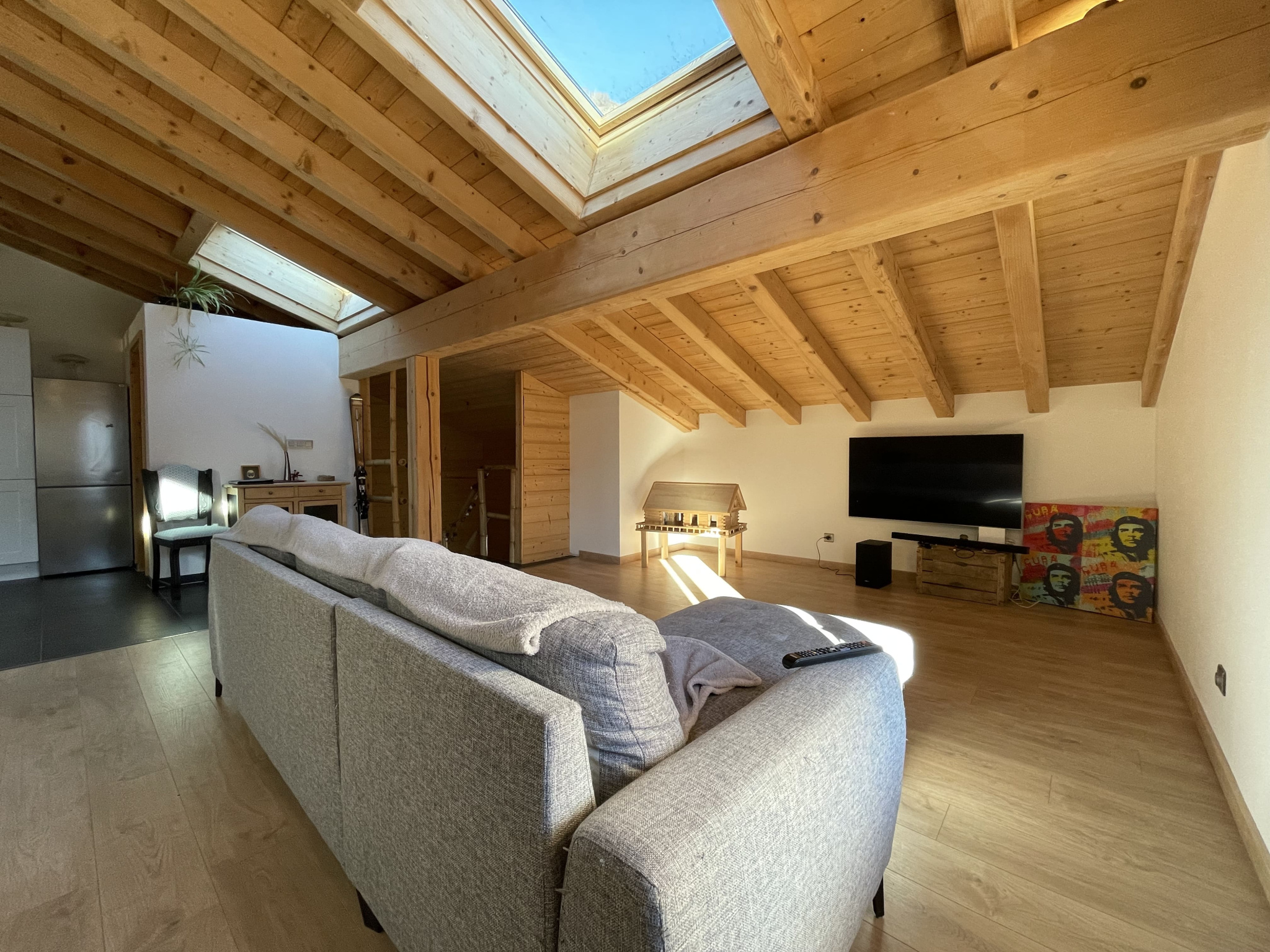 A l’étage une grande cuisine ouverte sur le salon séjour et un WC.