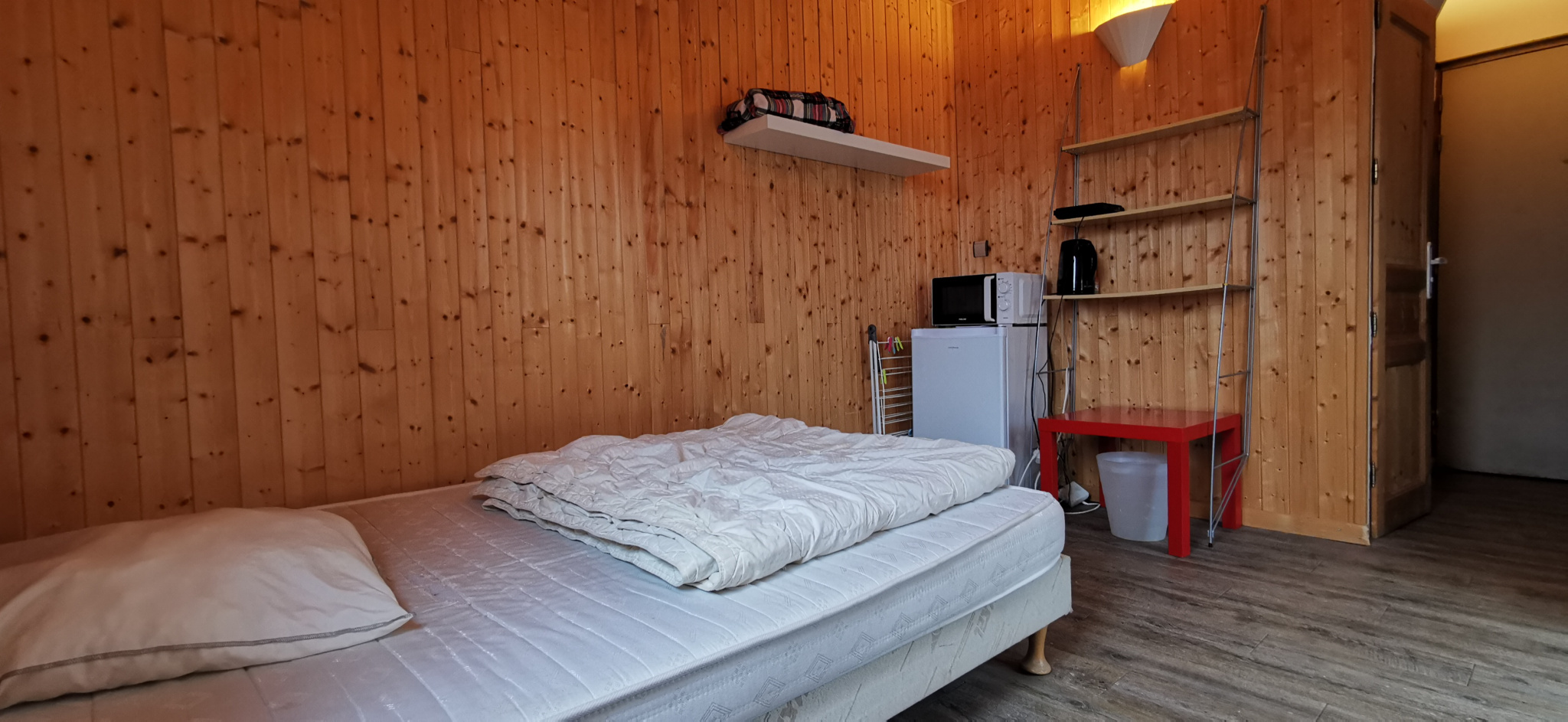 Au rez-de-chaussée : un hall d'entrée, trois garages, une chaufferie, un local technique et une cuisine commune aux chambres.