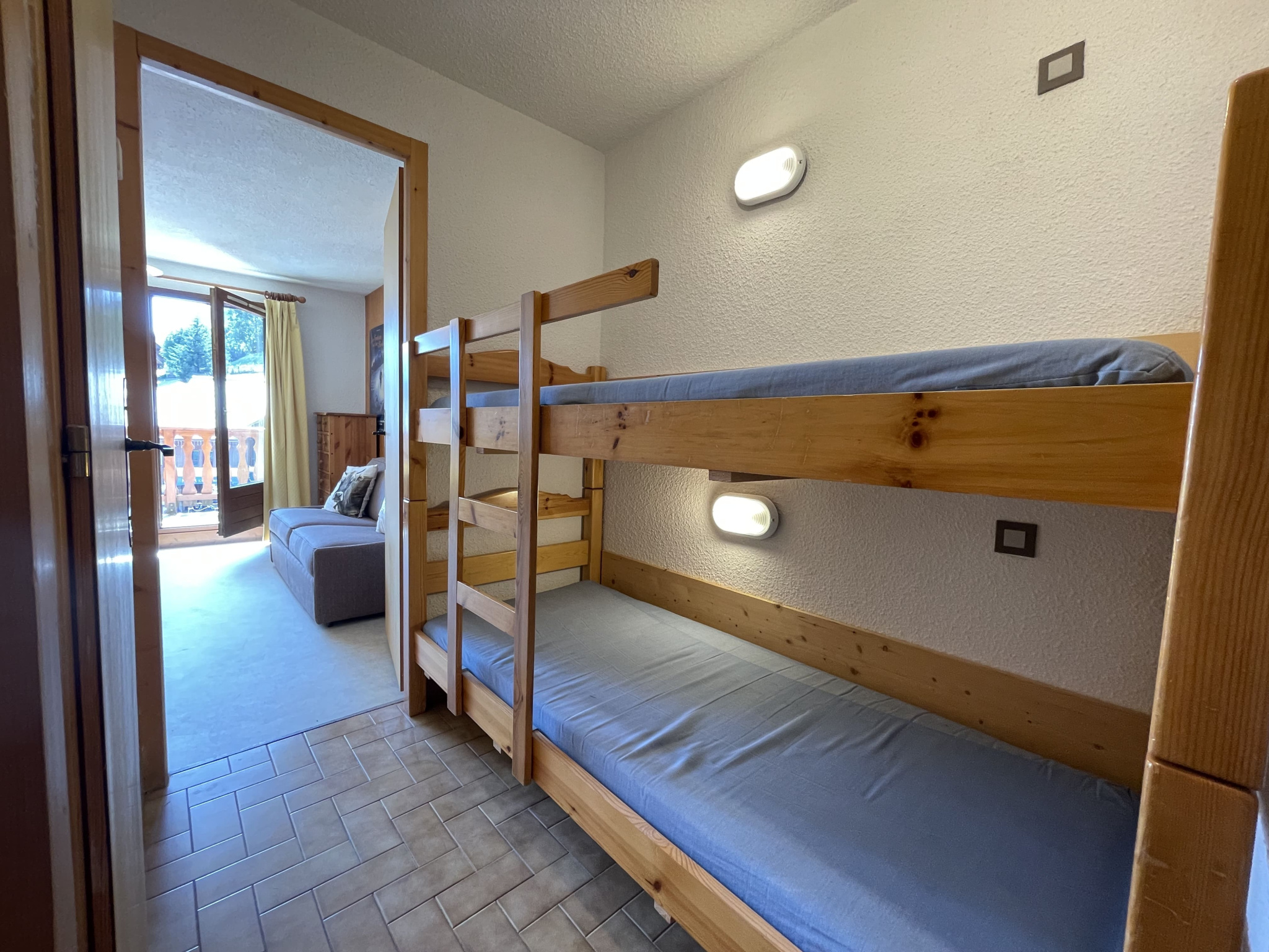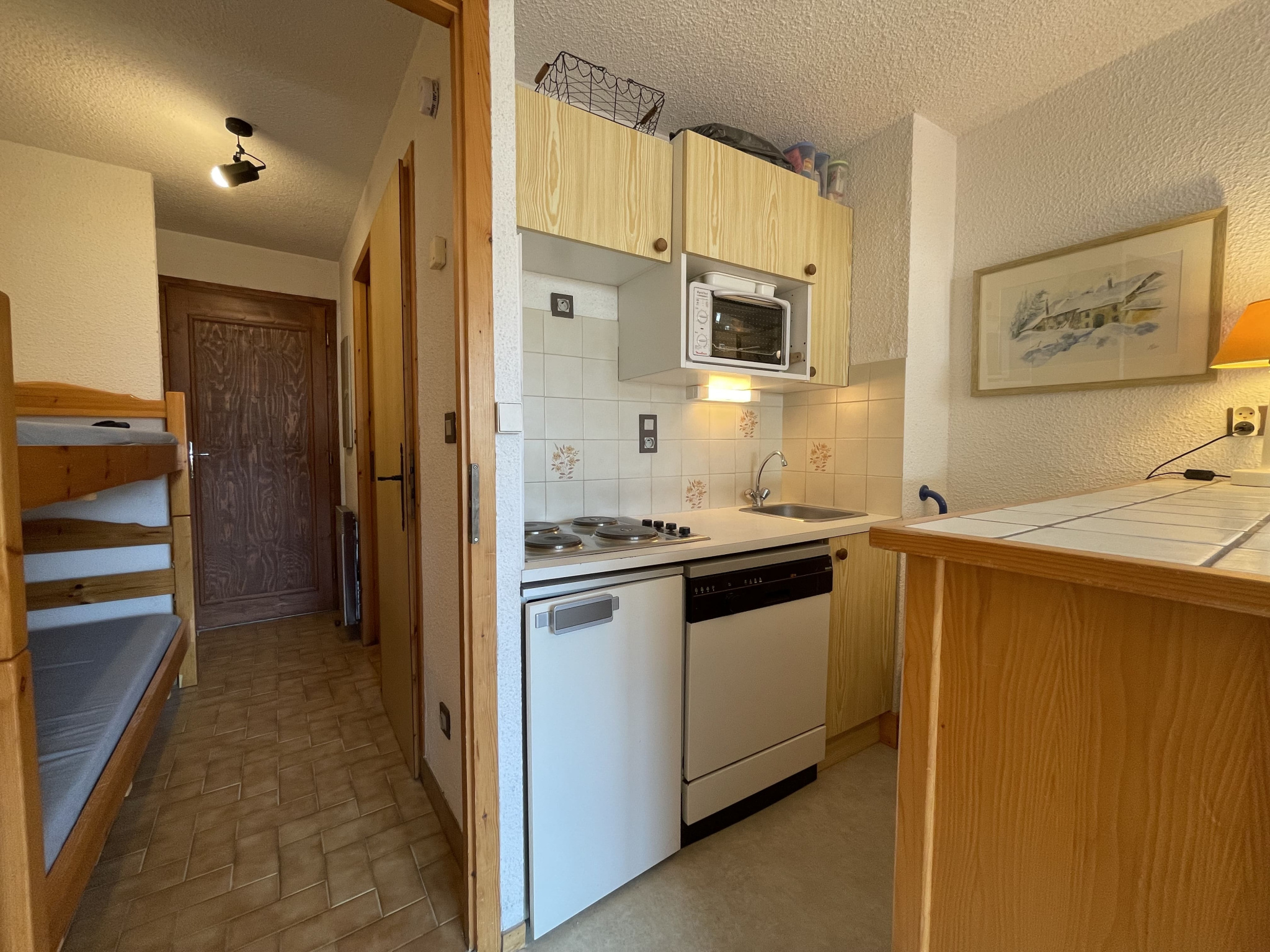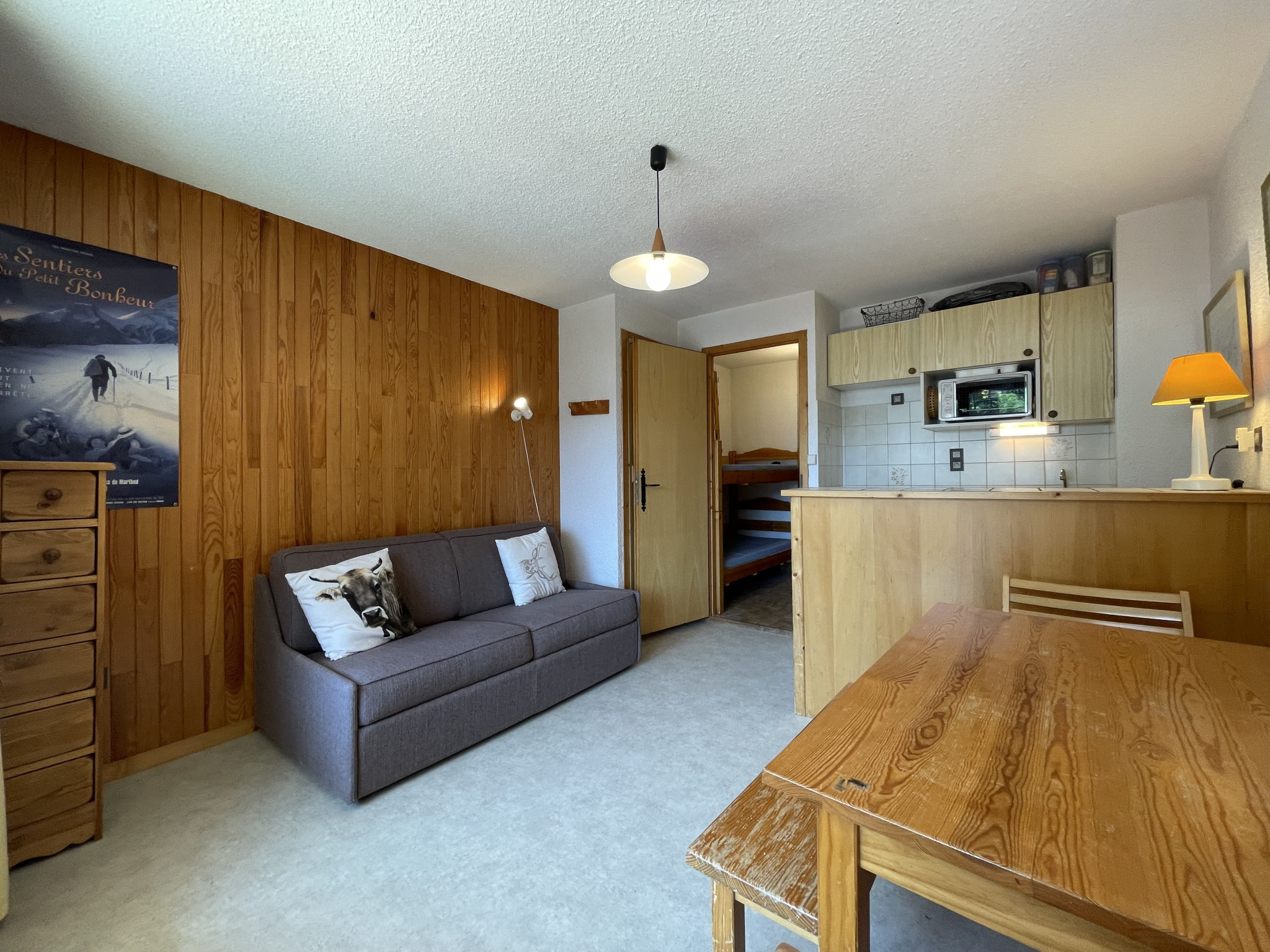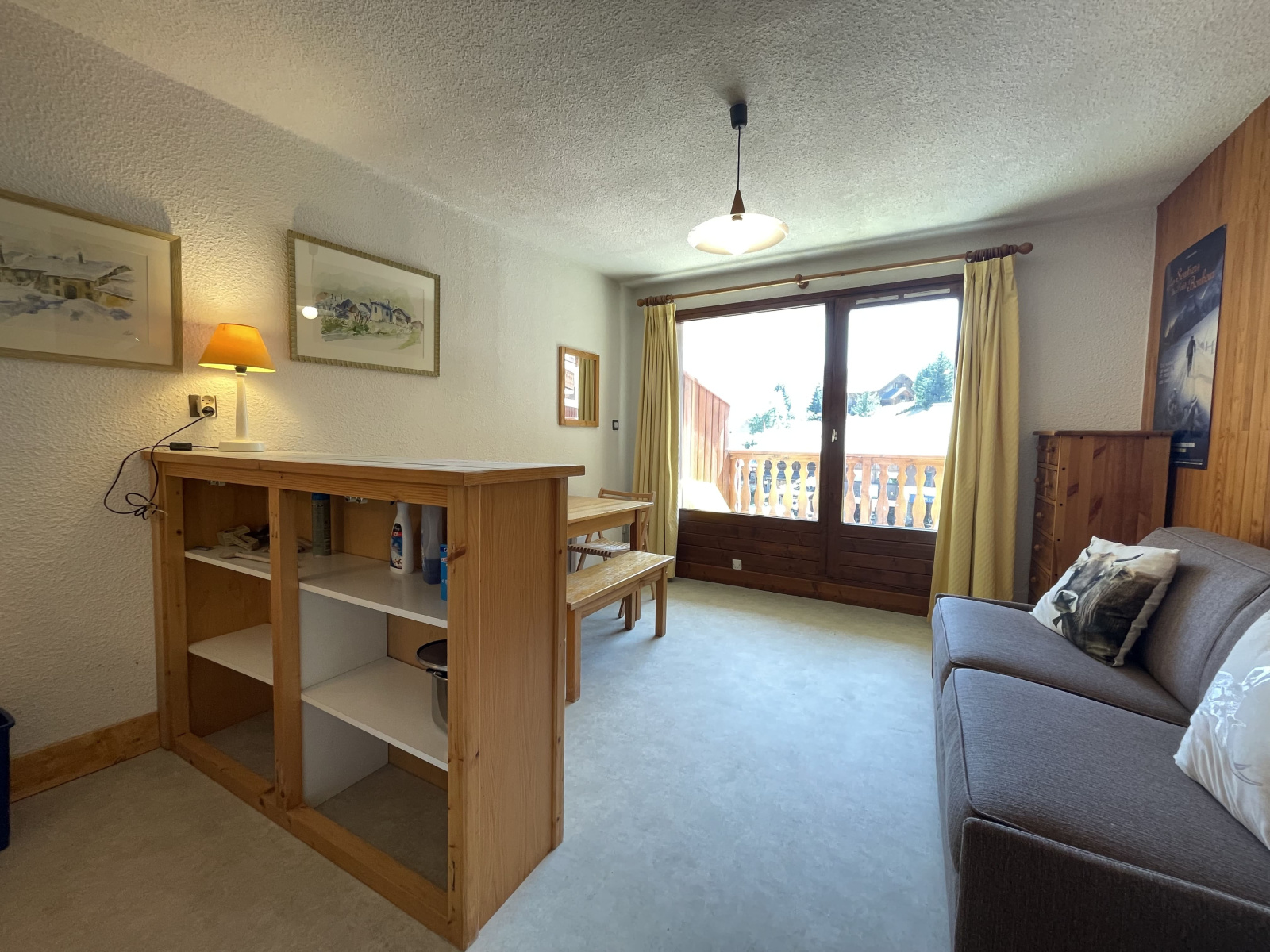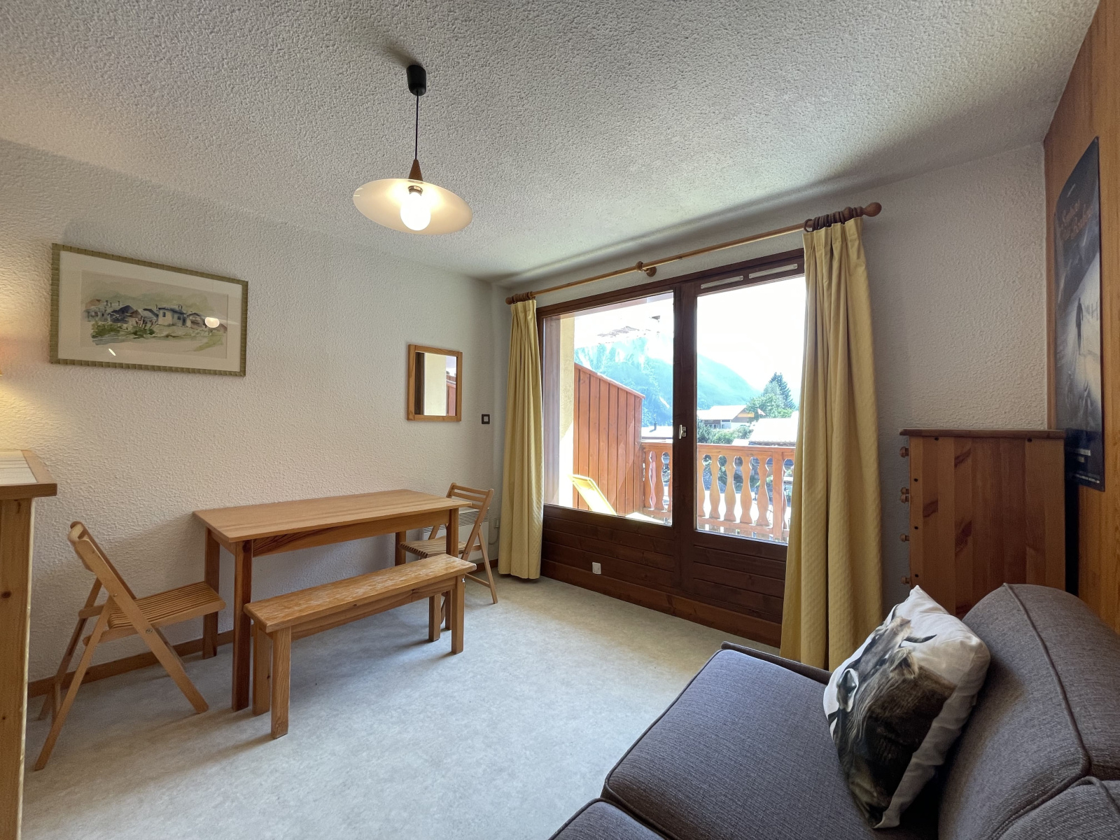 Le studio est très lumineux grâce à son exposition Sud-Ouest ainsi que sa grande terrasse donnant une vue dégagée sur les montagnes.