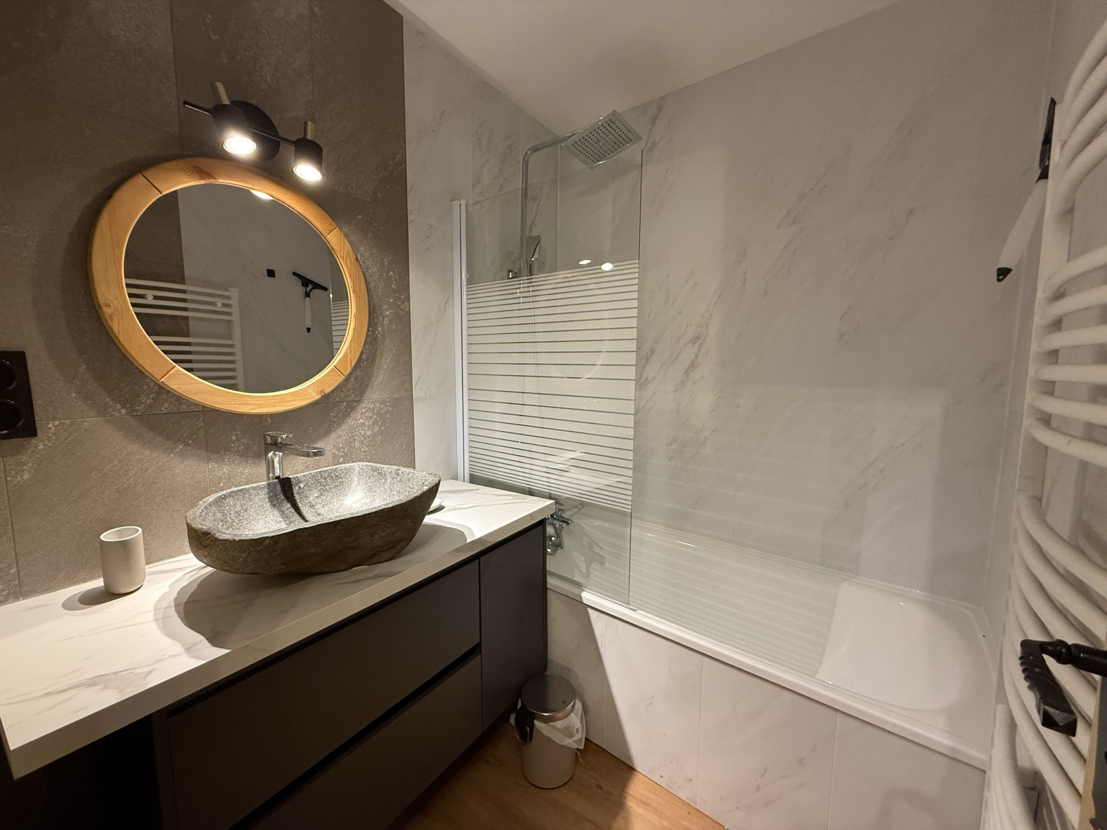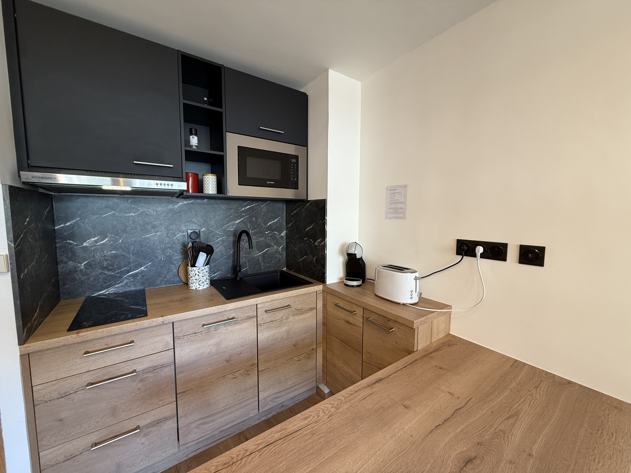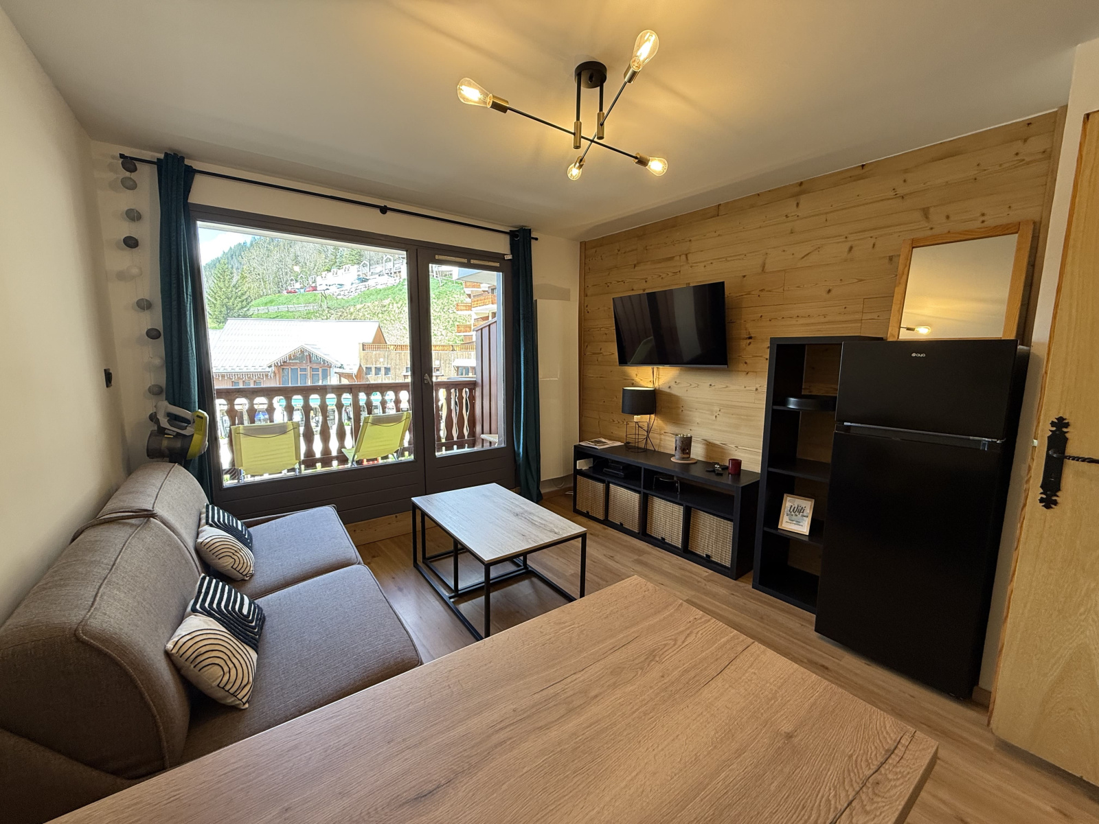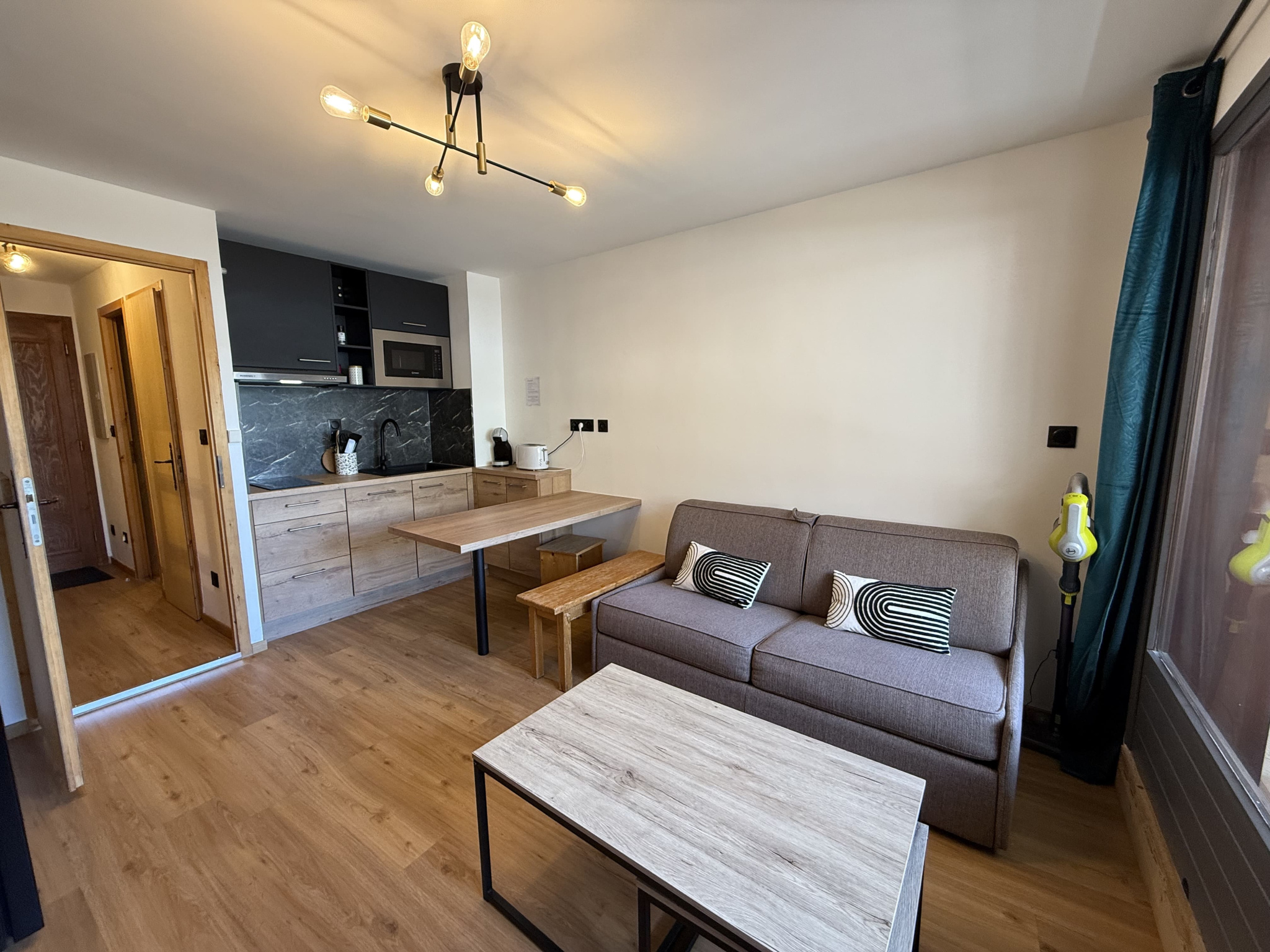 Le studio est très lumineux grâce à son exposition Sud-Ouest ainsi que sa grande terrasse donnant une vue dégagée sur les montagnes.