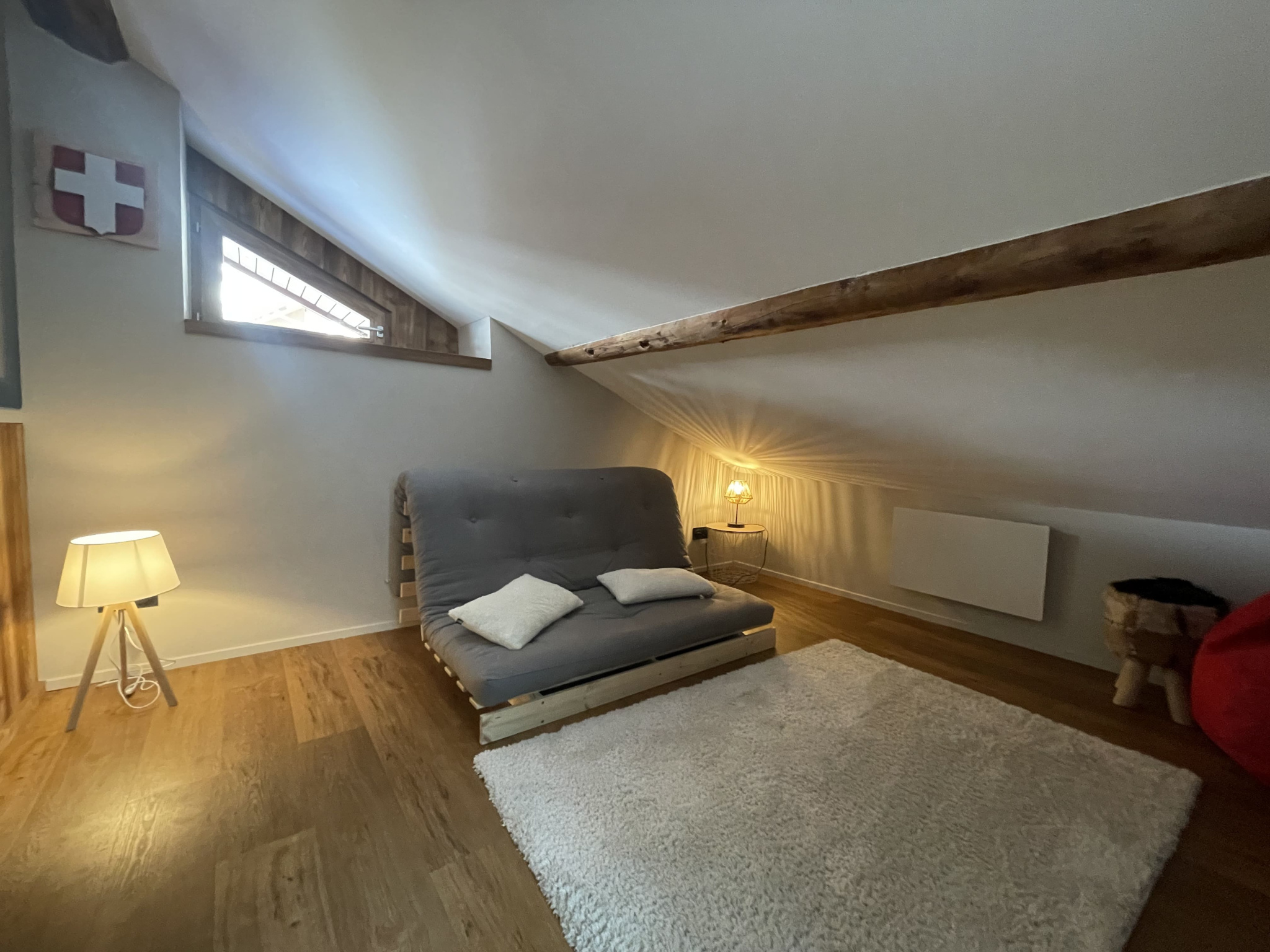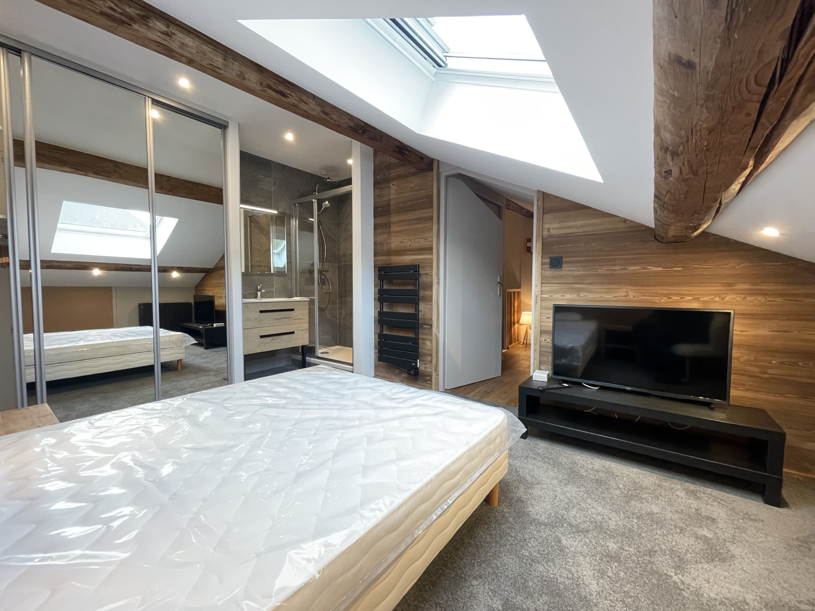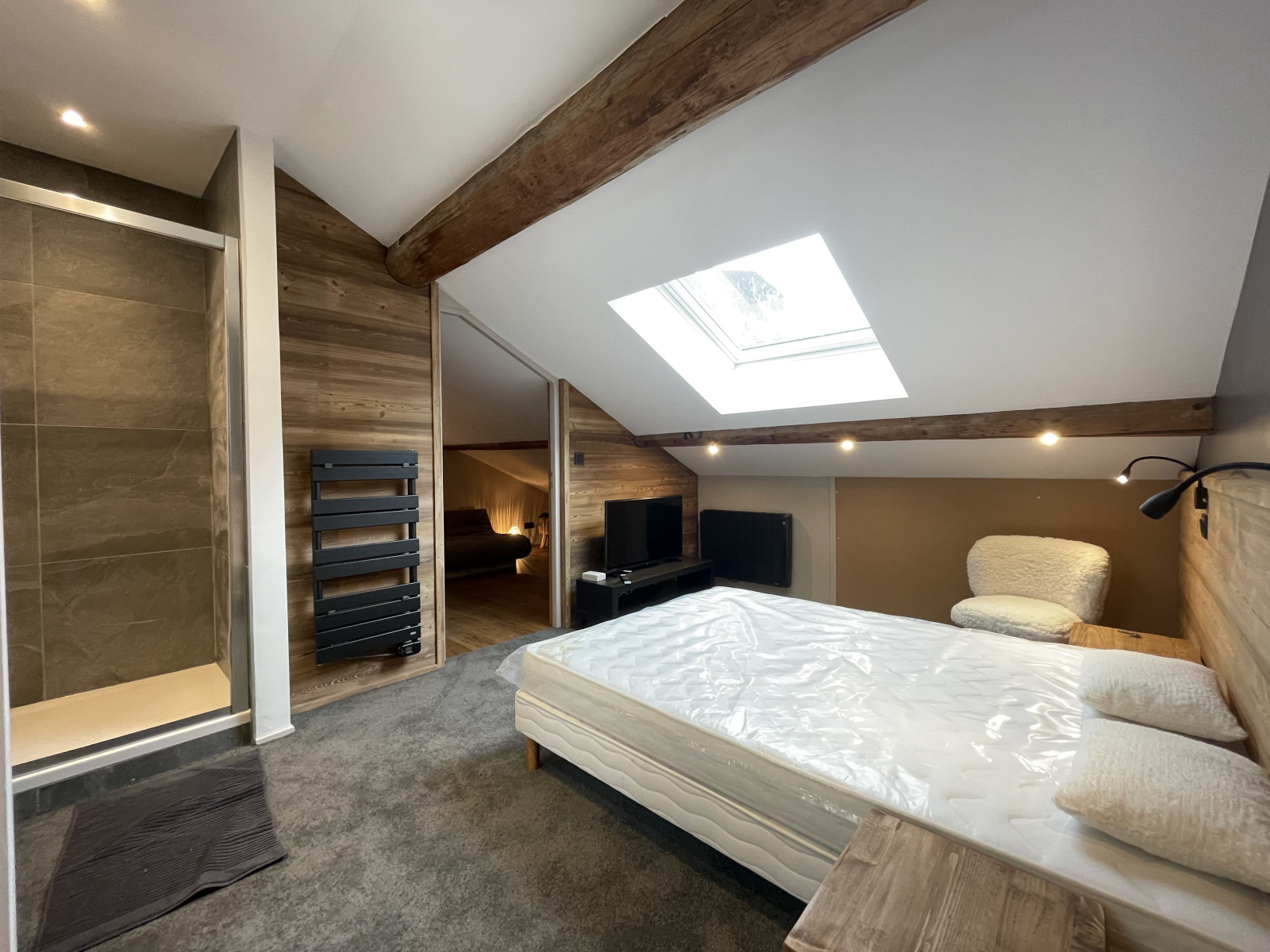 Au 1er étage : une chambre avec rangements, une cuisine ouverte sur le salon-séjour avec balcon, une salle d’eau, un WC séparé et un ski room.