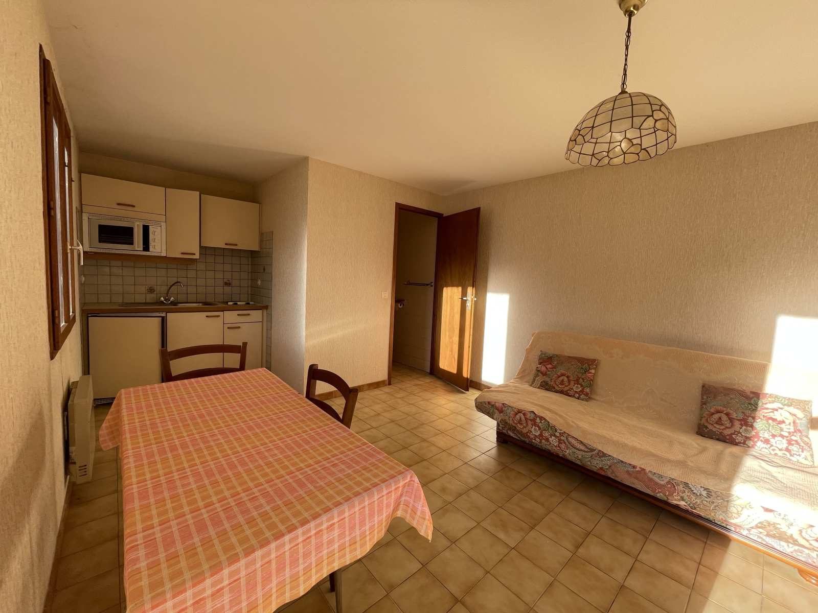 Une cuisine salon-séjour, une salle d'eau avec WC et une chambre avec rangements.