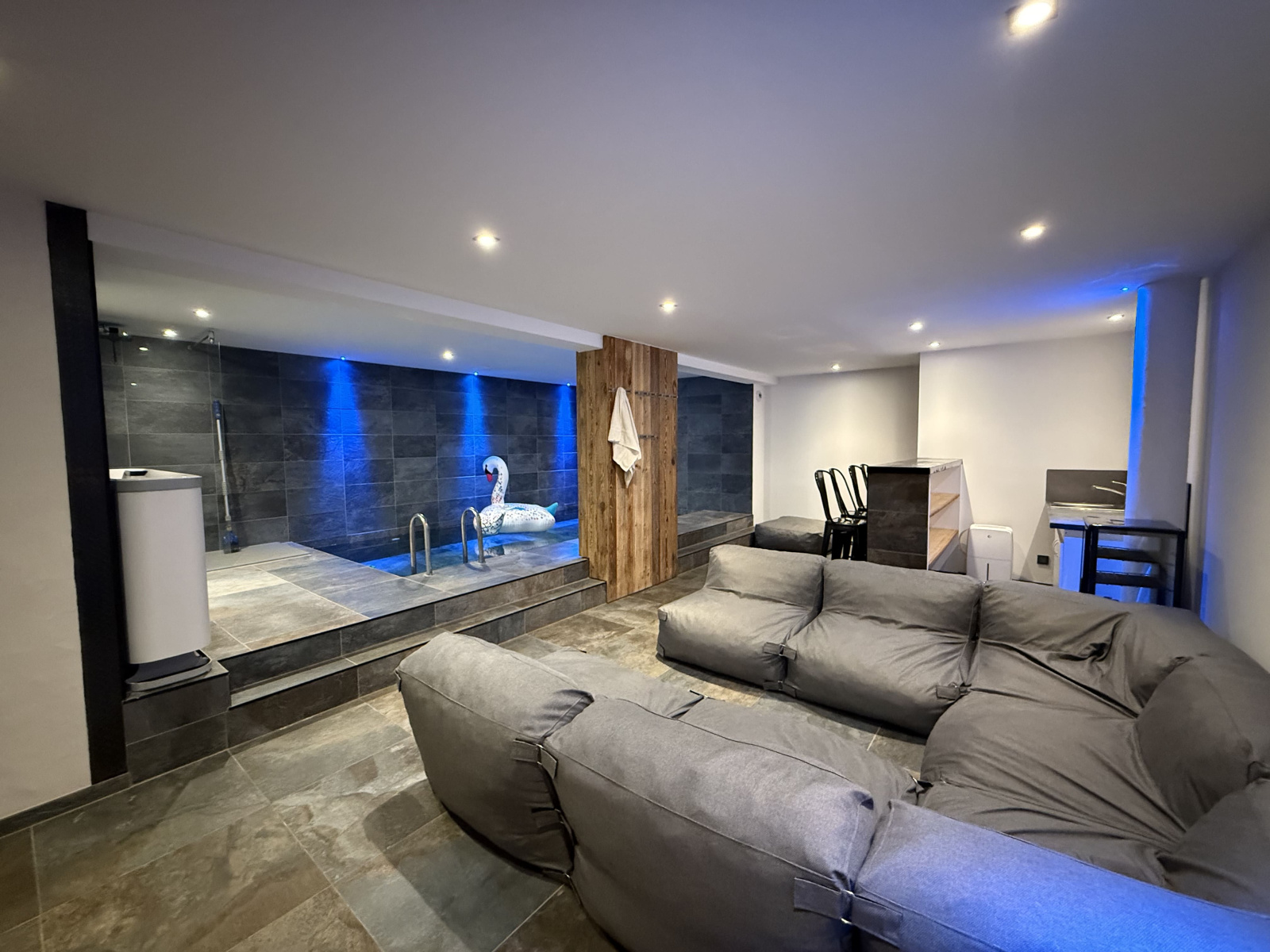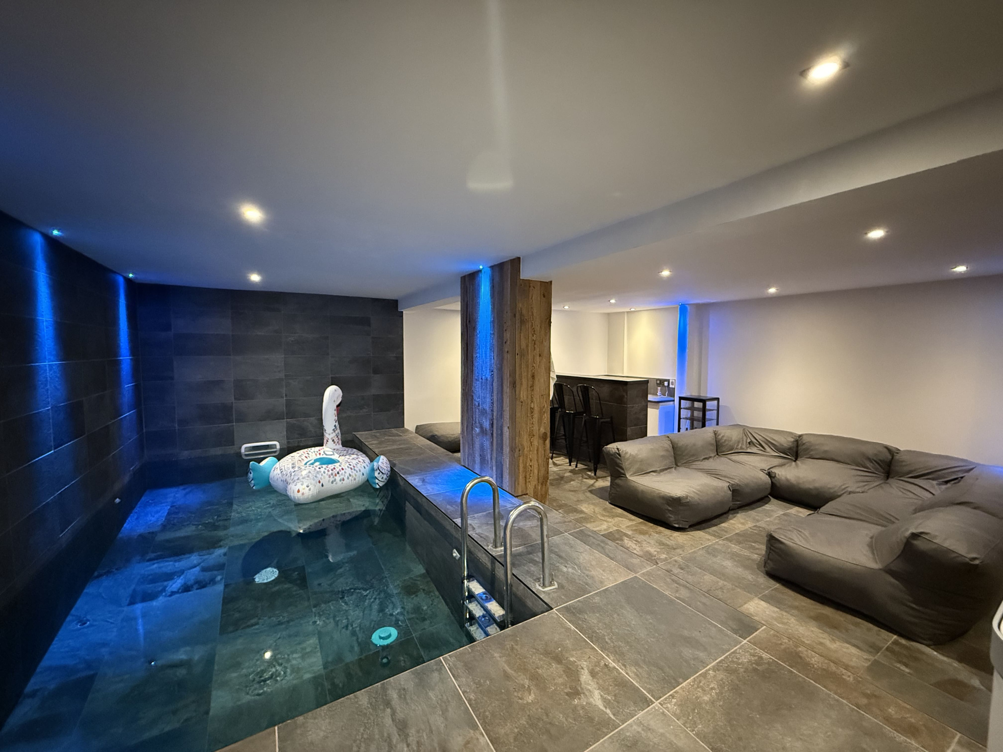 Le sous-sol est dédié à la détente avec une piscine chauffée, un sauna et une douche à l’italienne et un wc.