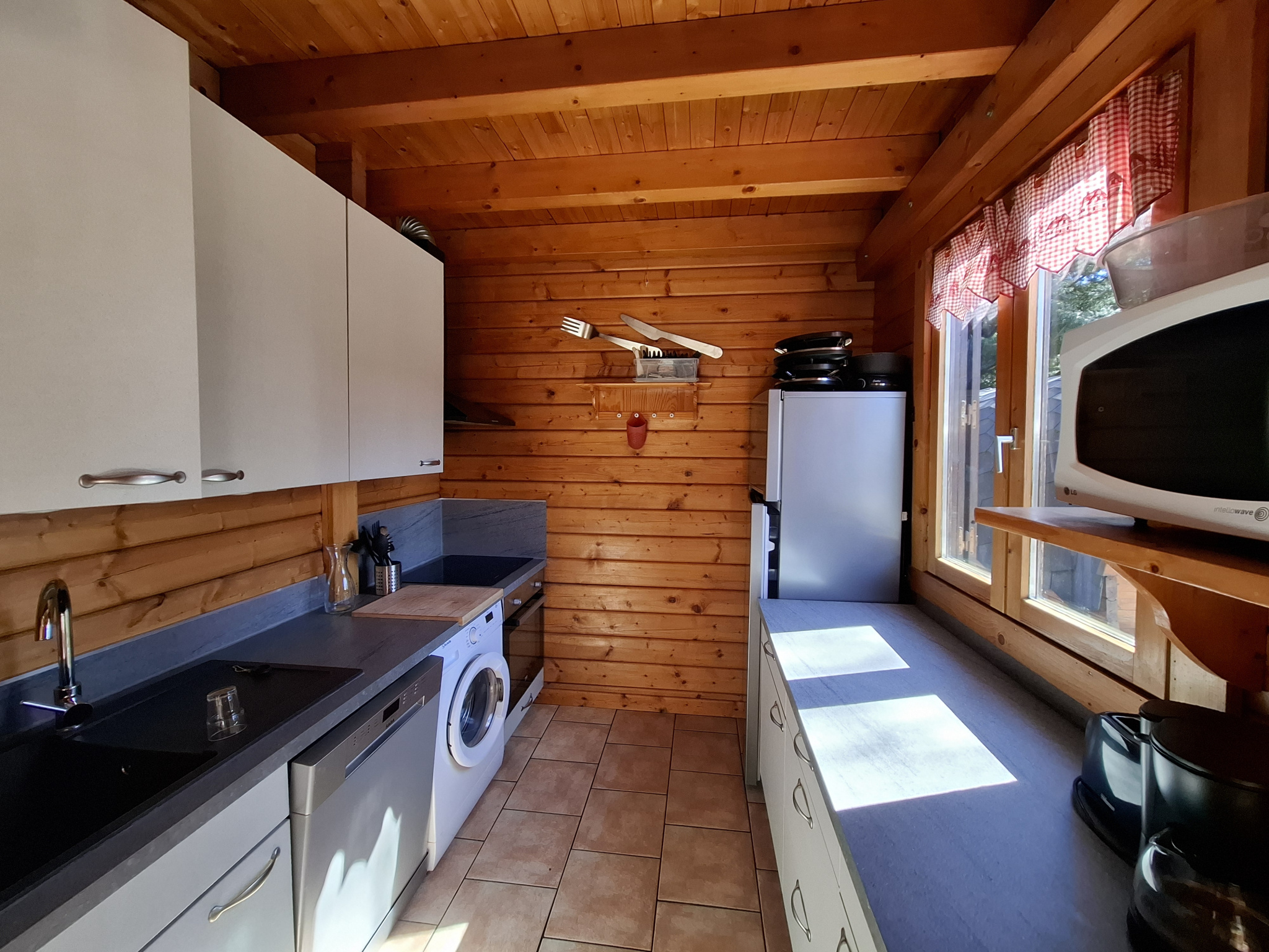 Le rez-de-chaussée dispose d’un grand espace de vie avec salon et cuisine ouverte, ainsi qu’une chambre, une salle de douche et un WC séparé. À l’étage, cinq chambres supplémentaires permettent d’accueillir confortablement familles et groupes, avec une configuration adaptée à tous. Une deuxième salle de douche et un WC séparé viennent compléter cet espace.